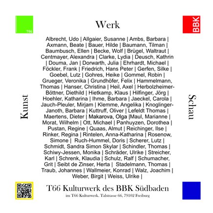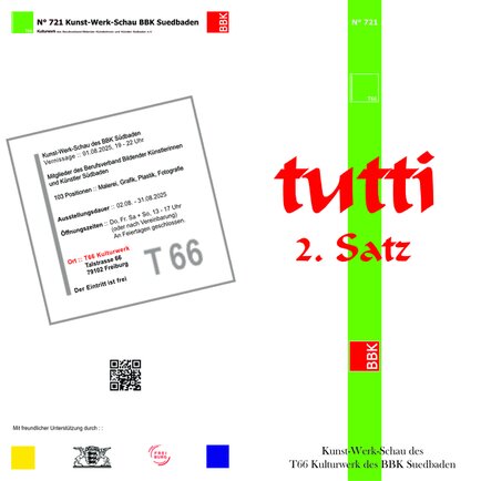N° 721 Kunst-Werk-Schau des BBK Südbaden "tutti" - 2. Satz Vernissage :: 01.08.2025, 19 - 22 Uhr Mitglieder des Berufsverband Bildender Künstlerinnen und Künstler Südbaden 104 Positionen :: Malerei, Grafik, Plastik, Fotografie Ausstellungsdauer :: 02.08. - 31.08.2025 Öffnungszeiten :: Do, Fr. Sa + So, 13 - 17 Uhr (oder nach Vereinbarung) An Feiertagen geschlossen. Ort :: T66 Kulturwerk Talstrasse 66 79102 Freiburg Der Eintritt ist frei |