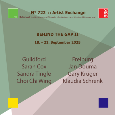 N° 722 nocturne :: Artist Exchange BEHIND THE CAP II Freiburg and Guildford, 2025 Guildford :: Sarah Cox - Sandra Tingle - Choi Chi Wing Freiburg :: Jan Douma - Gary Krüger - Klaudia Schrenk Vernissage :: Donnerstag, 18.09.2025, 18:30 Uhr KünstlerInnenaustausch zwischen den Partnerstädten Guildford und Freiburg, 2025. Im Juni 2025 fand Behind the gap I in der Guildford House Gallery statt. Beide Ausstellungen, Behind the gap I und II, wurden durch die Zusammenarbeit mit der Guildford Twinning Association ermöglicht. Mit Dank an die Städte Guildford und Freiburg. Ausstellungsdauer :: 18.09. - 21.09.2025 Öffnungszeiten :: Do, Fr. Sa + So, 13 - 17 Uhr (oder nach Vereinbarung) An Feiertagen geschlossen. Ort :: T66 Kulturwerk Talstrasse 66 79102 Freiburg Der Eintritt ist frei |